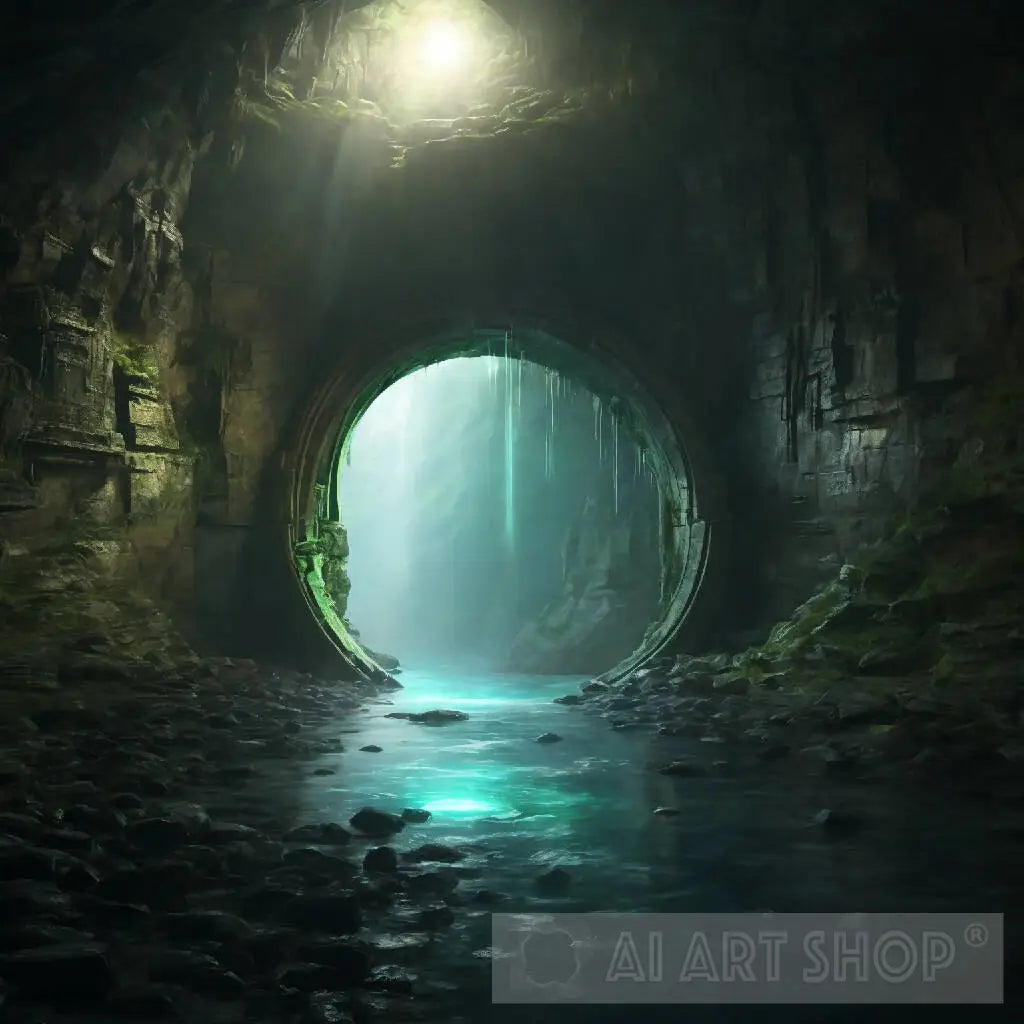 A magic portal to another world. The portal is in an abandoned cave with a river entering the cave. Sunlight. The portal is circular in front of the portal. A light fog comes from the portal. A faint green light comes from the portal.