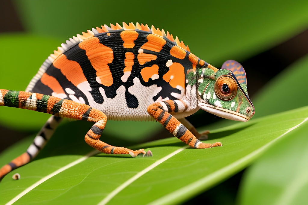 The image features a lizard resting on a leaf. This scaled reptile is likely part of the wildlife in an outdoor setting. The scene captures the natural habitat and behavior of the lizard, possibly a chameleon, evident by its unique coloration and texture.