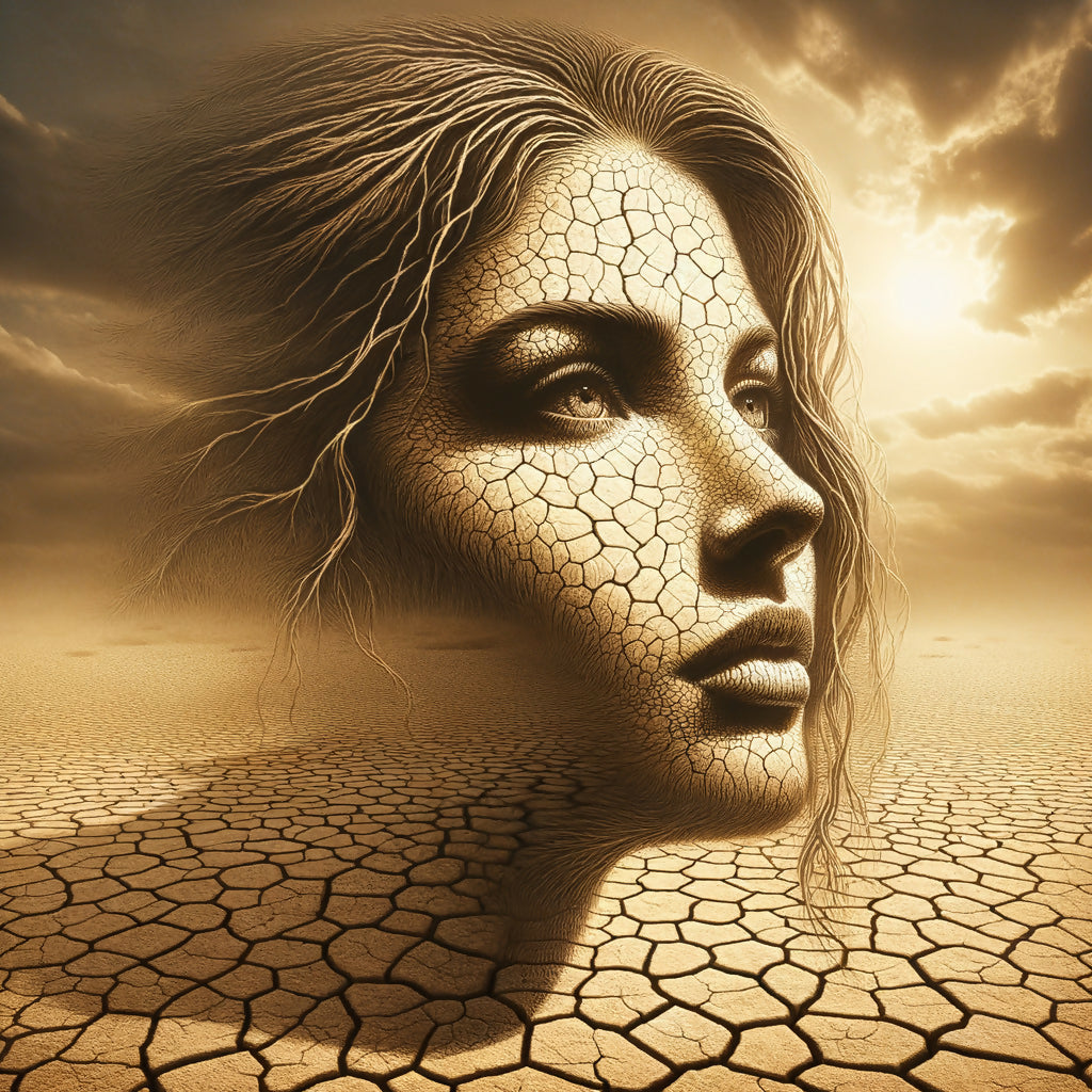 A striking digital artwork featuring a surreal female portrait formed by cracked desert ground, embodying symbolism and creativity with detailed textures and natural elements.