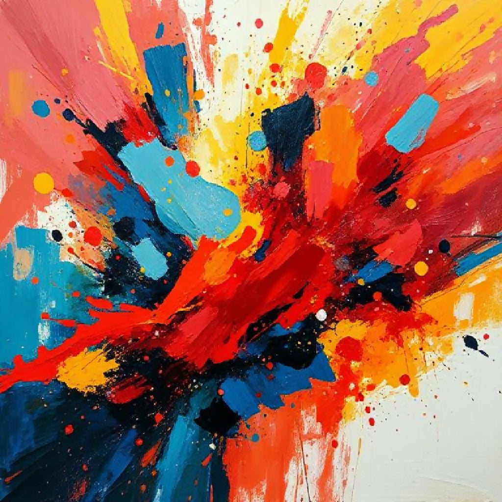 An expressive abstract painting of an unforgettable moment — bold brushstrokes with splashes of fiery reds, blues, and yellows colliding in motion, symbolizing the intensity of emotions and the raw beauty of fleeting memories