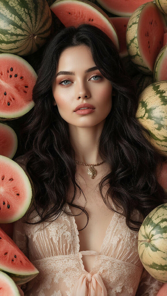 exquisite high fashion photography of a captivating European model woman with wavy long black hair and flawless porcelain skin, surrounded by sliced and whole watermelons in a serene and surreal setting, presented in exquisite detail in 4K Ultra High Definition, evoking a sense of fairy-tale wonder, where the harmonious combination of pastel tones and soft natural light creates a mesmerizing, unearthly atmosphere, with the model's bright blue eyes and subtle smile as the focal point, and the watermelons arranged in a delicate, whimsical pattern around her.