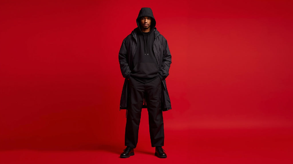 exquisite high fashion photography of a male against a red background, wearing a black hooded sweatshirt with the hood down, a short black windbreaker, wide black pants, and black matte shoes, photographed full-length with hands in jacket pockets.