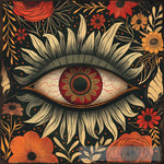 Amidst the petals' vibrant dance, an eye does watch and see, A sunflower's gaze that pierces through the foliage so free, In colors warm and rich, it holds the secrets of the night, A silent guardian of the blooms, in nature's vivid light.