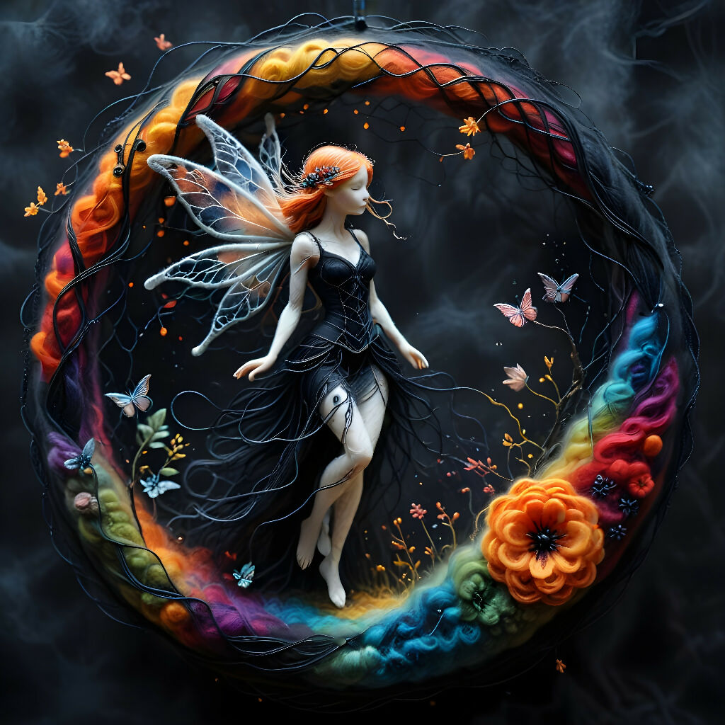 A figure sculpted with highly detailed features, including a flowing black dress, delicate wings, and long, auburn hair. Her expression is serene and slightly contemplative. Various small floral motifs and accents scattered around, embedded along the inside of the crescent's interior edge.