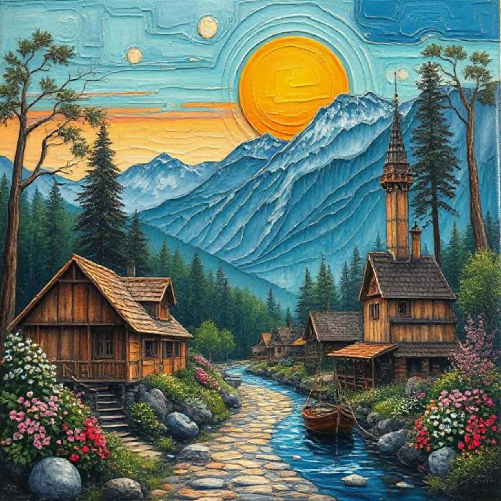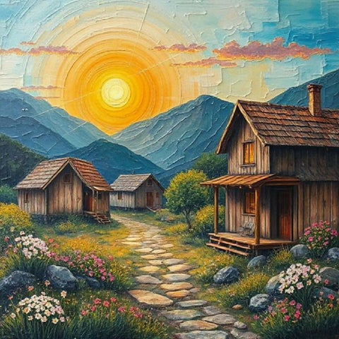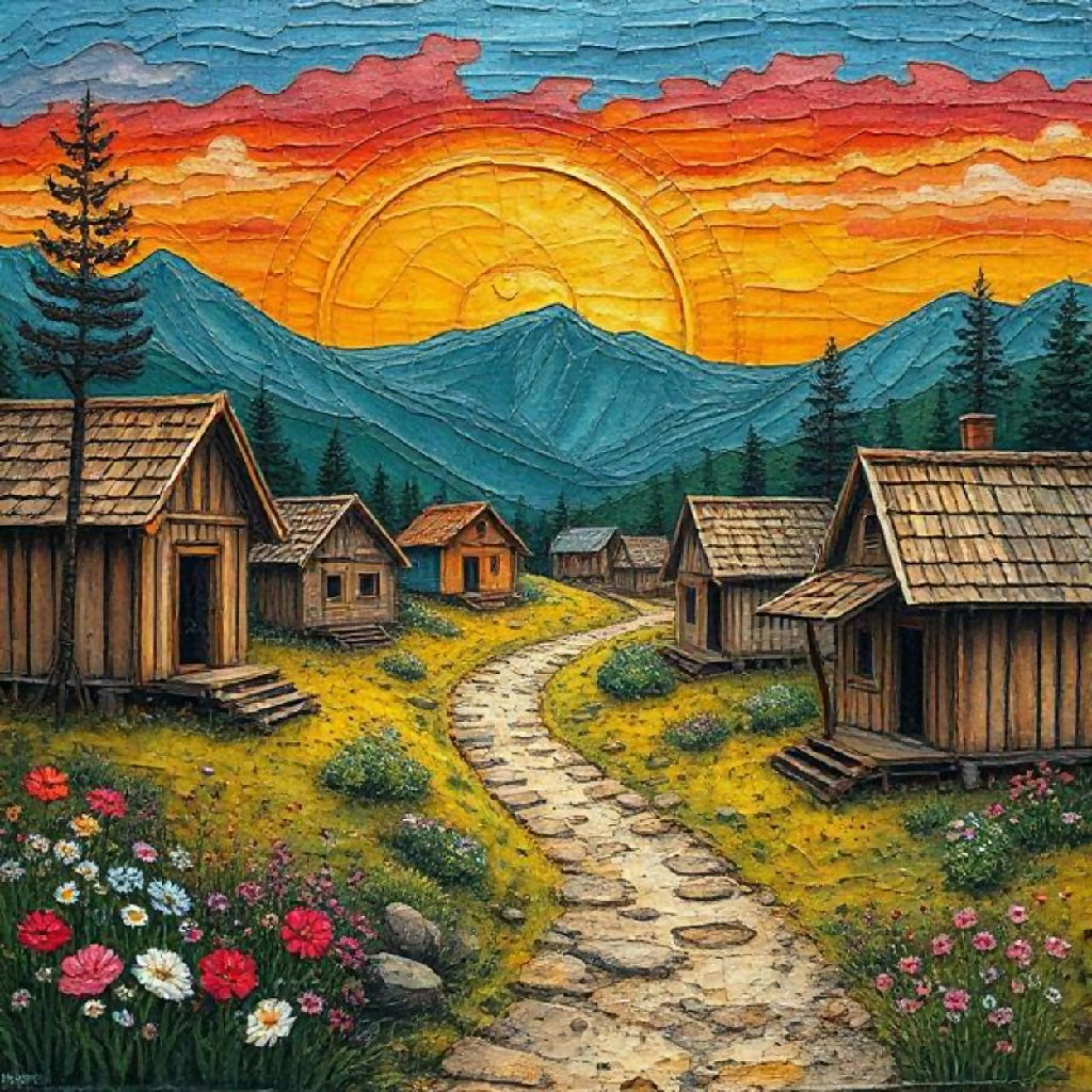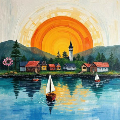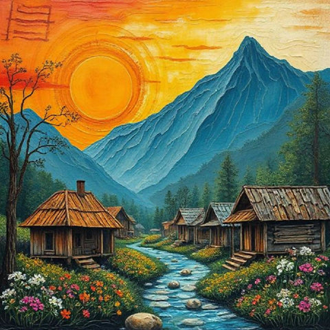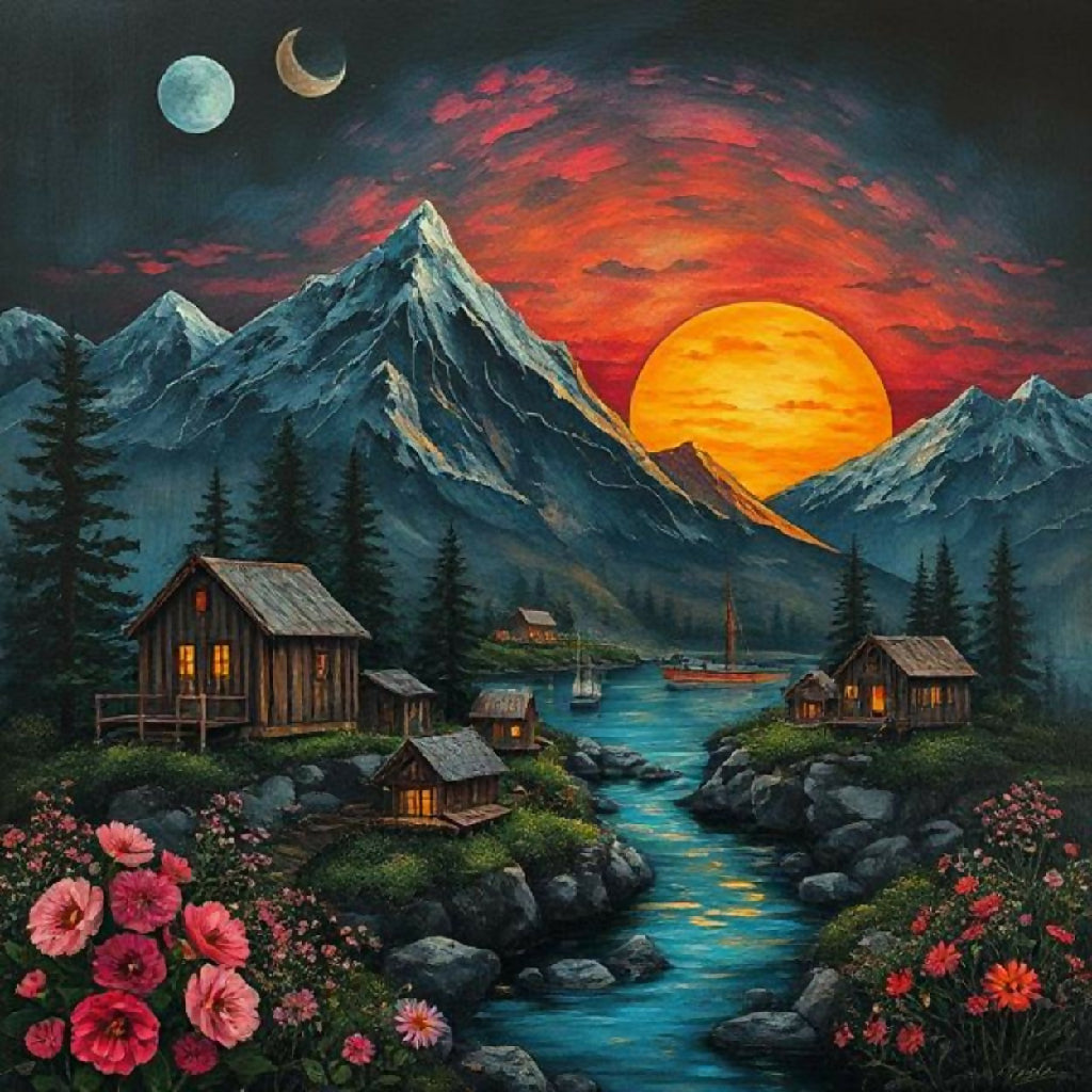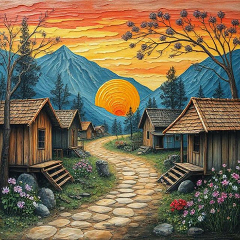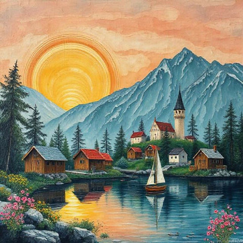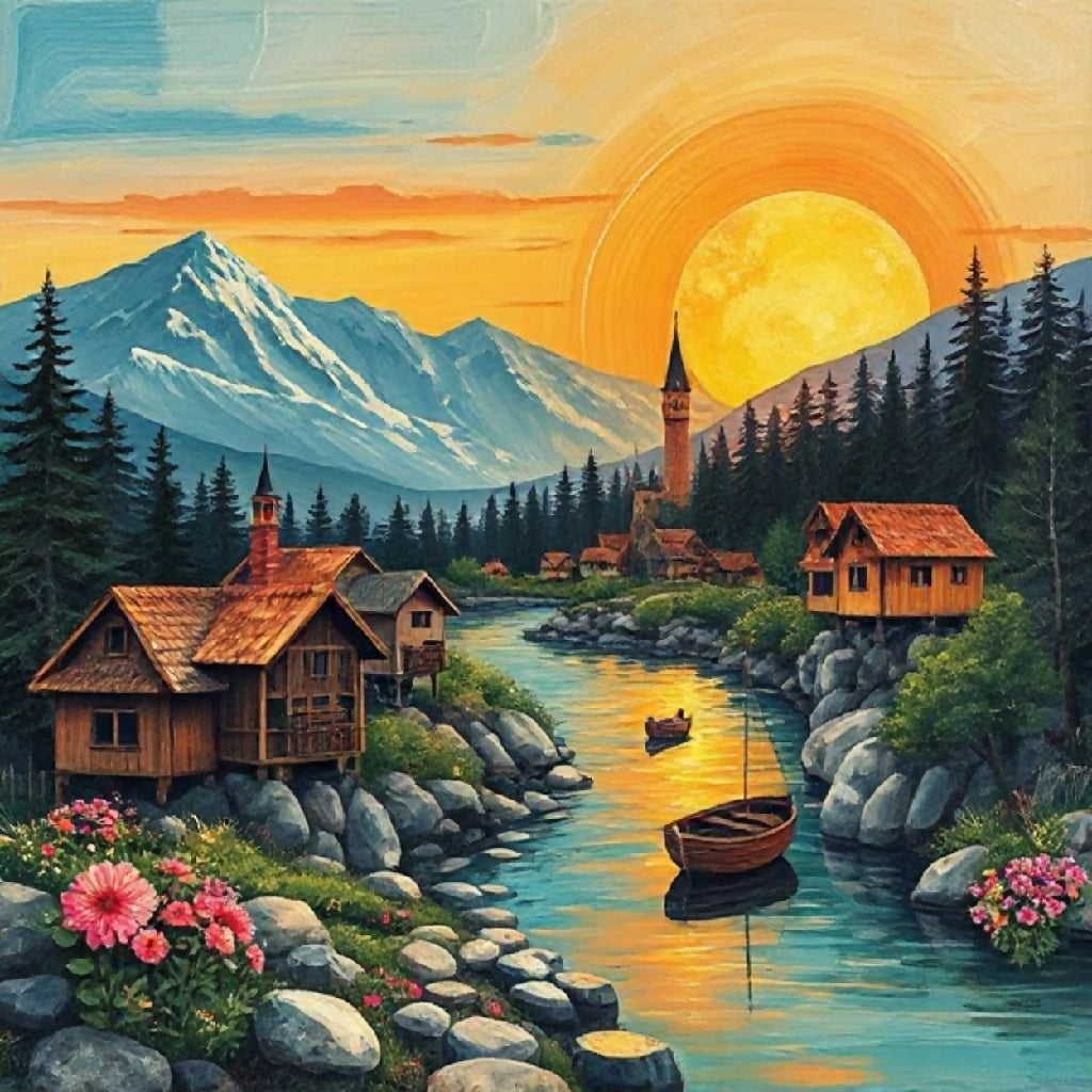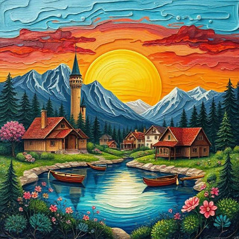 A vibrant acrylic painting depicting a fairytale village at sunset. The artwork features charming cottages with red roofs, a tall castle-like tower, and a peaceful river with small wooden boats. Majestic snow-capped mountains rise in the background, while the golden sun sets behind them, casting a warm glow over the landscape. Pine trees, blooming flowers, and colorful skies add to the magical, dreamlike atmosphere.