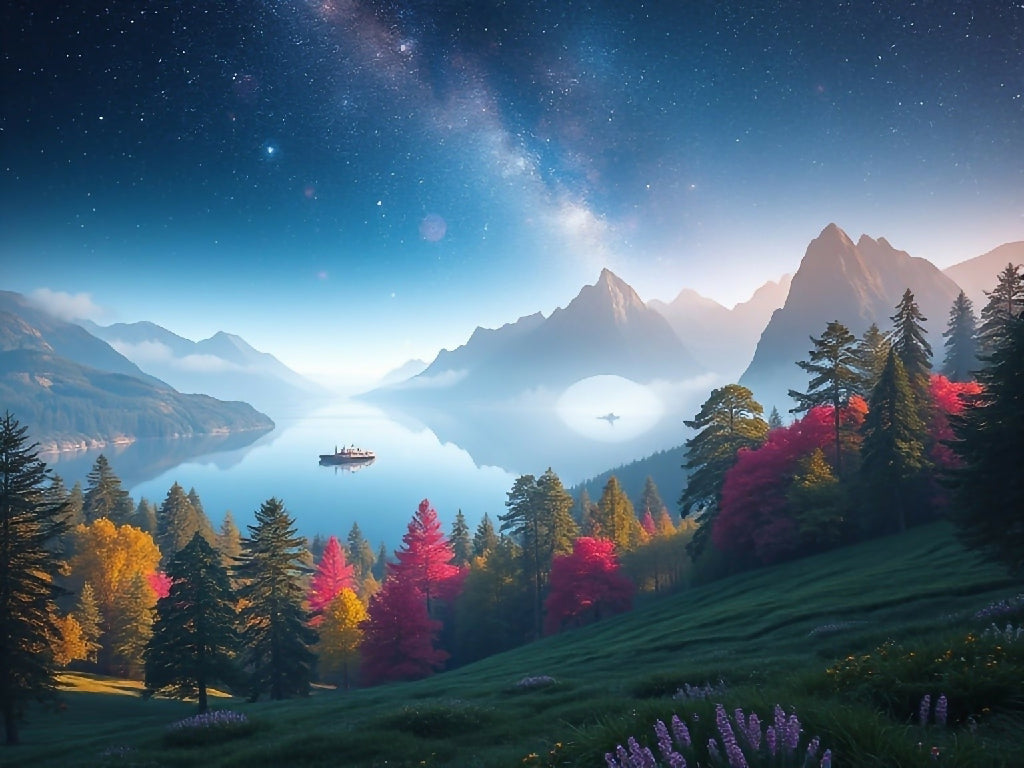 A breathtaking, fantastic landscape filled with vibrant colors and harmonious composition of natural wonders. In the foreground are magnificent, flowering trees, whose branches are in full bloom and shine in soft pastel shades.  This fantastic landscape with flowering trees and mountain lake gives a sense of peace, beauty and the unspoiled splendor of nature.