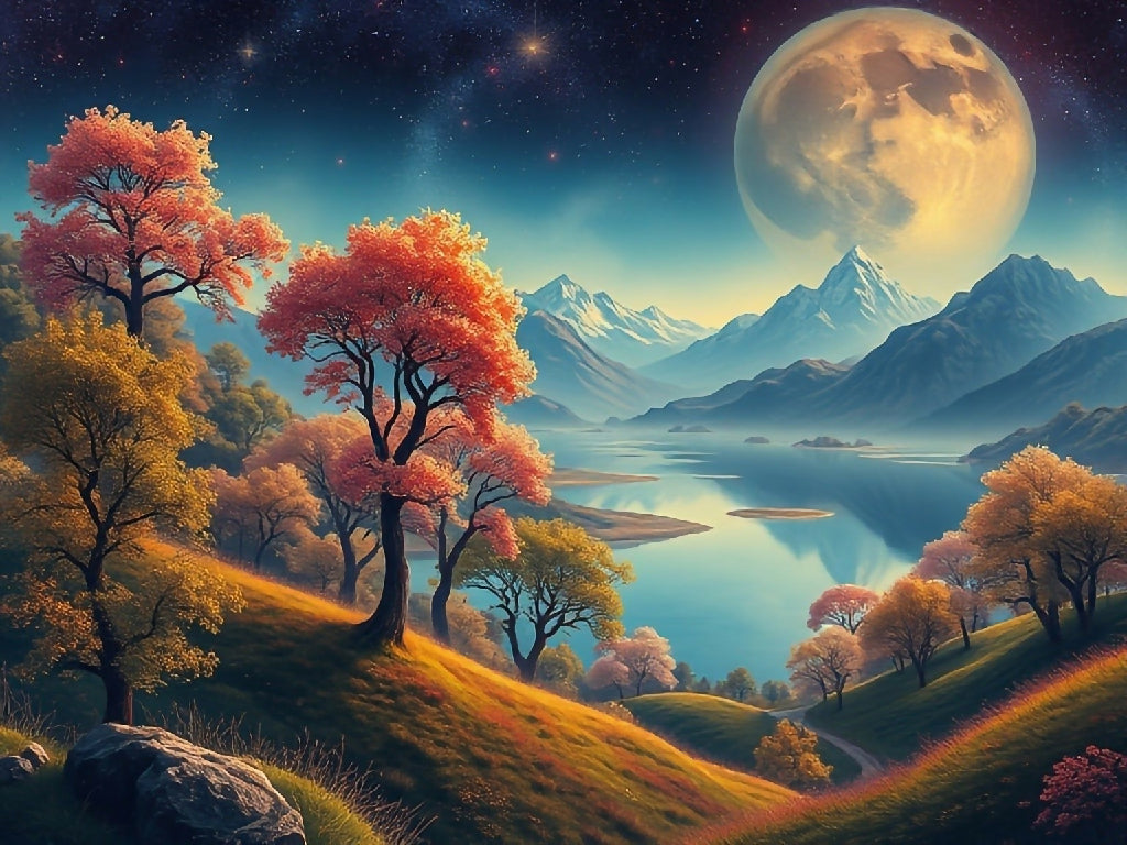 A breathtaking, fantastic landscape filled with vibrant colors and harmonious composition of natural wonders. In the foreground are magnificent, flowering trees, whose branches are in full bloom and shine in soft pastel shades. This fantastic landscape with flowering trees and mountain lake gives a sense of peace, beauty and the unspoiled splendor of nature.