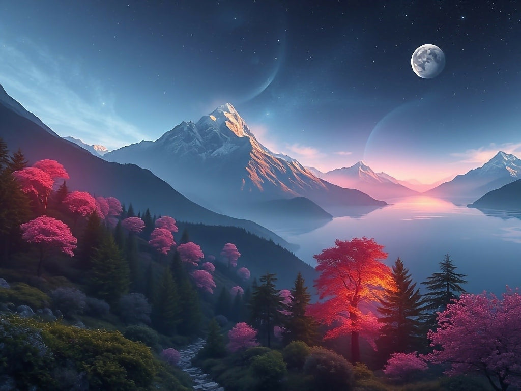 A breathtaking, fantastic landscape filled with vibrant colors and harmonious composition of natural wonders. In the foreground are magnificent, flowering trees, whose branches are in full bloom and shine in soft pastel shades.  This fantastic landscape with flowering trees and mountain lake gives a sense of peace, beauty and the unspoiled splendor of nature.