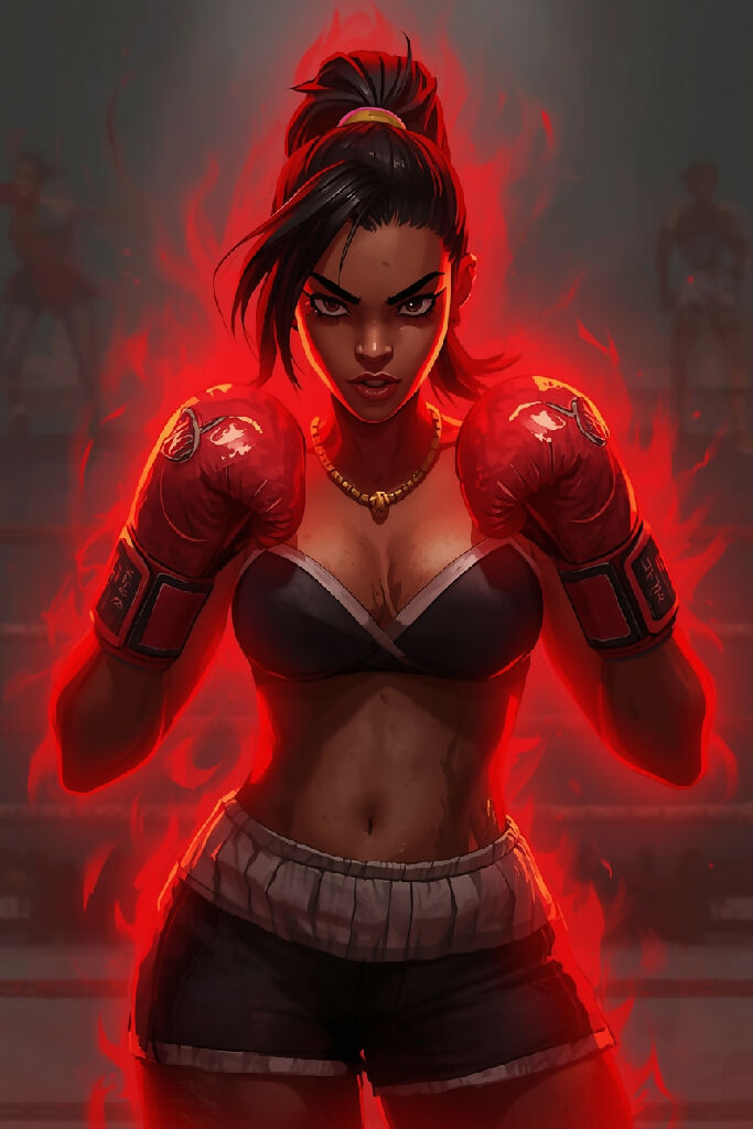 Fantasy African female street boxer with a strong and athletic build, wearing a pair of worn boxing gloves and a determined expression, radiating a vibrant red aura that envelops her entire body, standing confidently in a dimly lit boxing ring with a neutral background, her dark skin glistening with sweat, her black hair tied back in a tight ponytail, her bright brown eyes blazing with intensity, a gold chain with a small pendant hanging around her neck, the red aura surrounding her like a fiery halo, with a few strands of hair loose and framing her face, her full lips set in a fierce line, the boxing ring's ropes and corners blurred in the background, the focus solely on the boxer and her radiant aura.