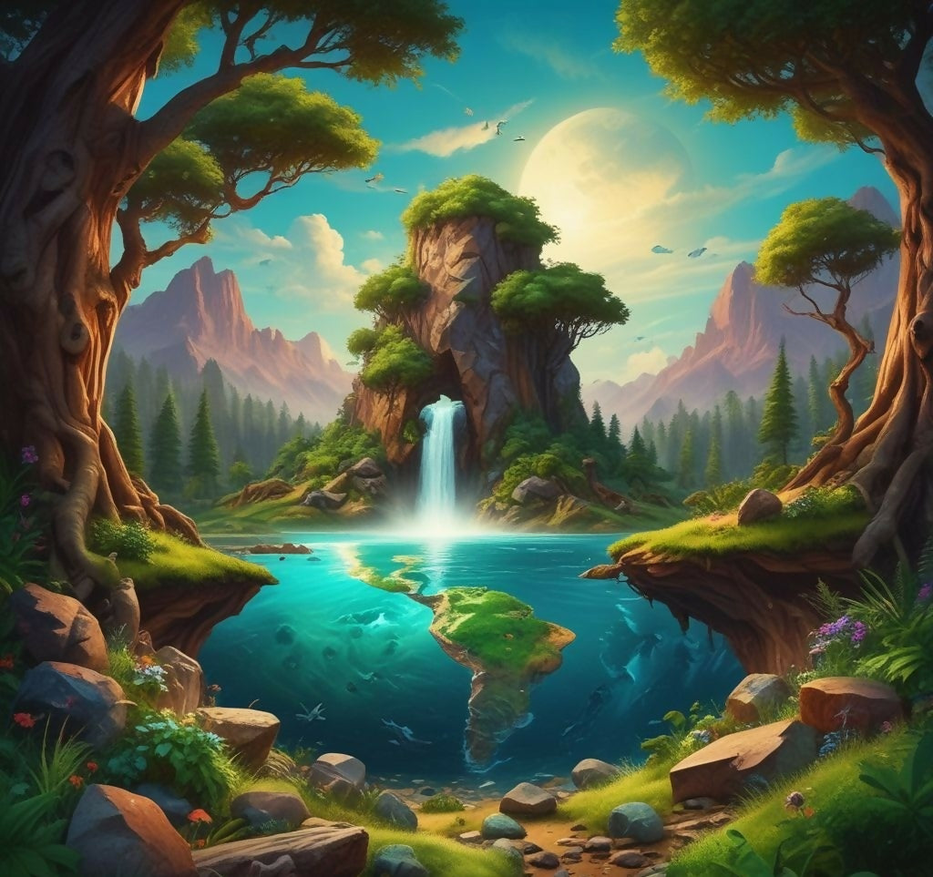 A breathtaking fantasy landscape featuring a glowing waterfall, lush trees, floating land, and a glowing moonlit sky—perfectly blending magic and natural wonder in digital art.