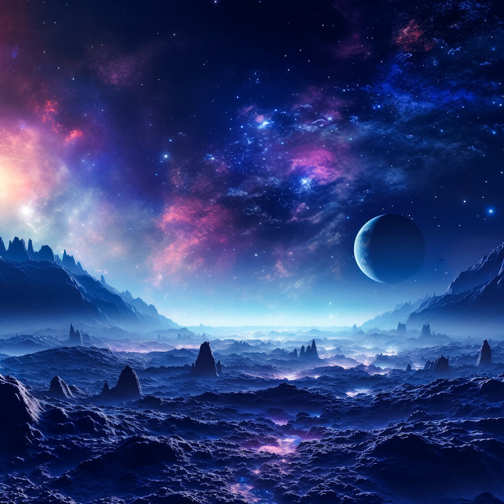 This stunning creation offers a view from an otherworldly planet, gazing up into a magnificent, star-filled sky. Multiple moons of varying sizes and colors orbit overhead, casting ethereal light across the landscape. The sky is a mesmerizing blend of vibrant nebulae and distant stars, creating a cosmic panorama that feels both enchanting and surreal. The planet's surface, with its unique textures and alien flora, adds to the otherworldly atmosphere. Perfect for bringing a touch of cosmic wonder to any space, this artwork captures the boundless beauty and mystery of the universe.