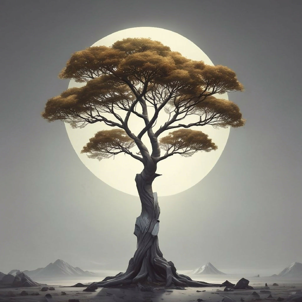 A fascinating abstract illustration of a fantasy tree designed in vibrant colors and unique shapes. The tree has a thick, curved trunk. The branches of the tree spread out in irregular, organic patterns and almost seem to dance as they reach into the sky.