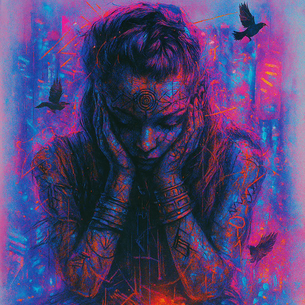 Die leuchtenden Muster und geometrischen Formen repräsentieren einen unruhigen Gedankenfluss, der von Elektrizität und Chaos geprägt ist. Die Neonfarben wirken zugleich hypnotisierend und fordernd, als jedes Symbol eine neue Facette der inneren Welt offenbaren würde.