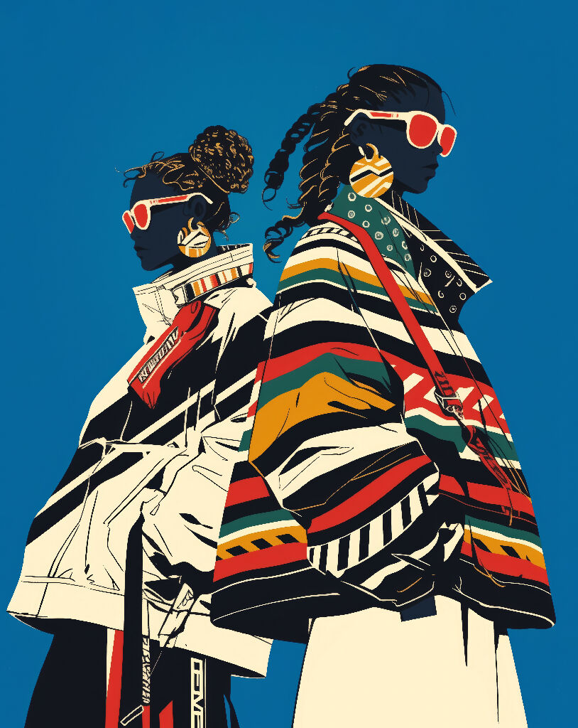 Keywords: fashion illustration, pop art, AI artwork, bold duo, cultural patterns, stylish wall art, modern design, vibrant decor.