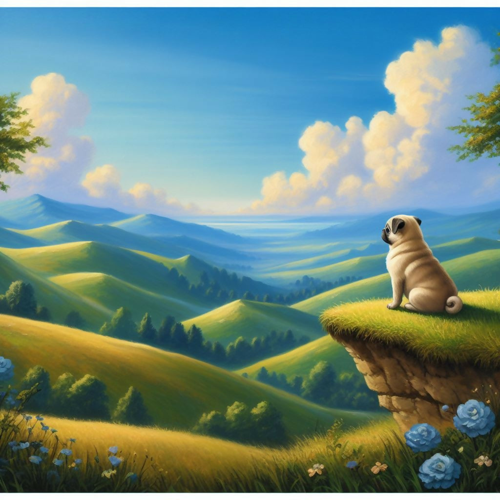 Fawn pug dog looks out over the mountains