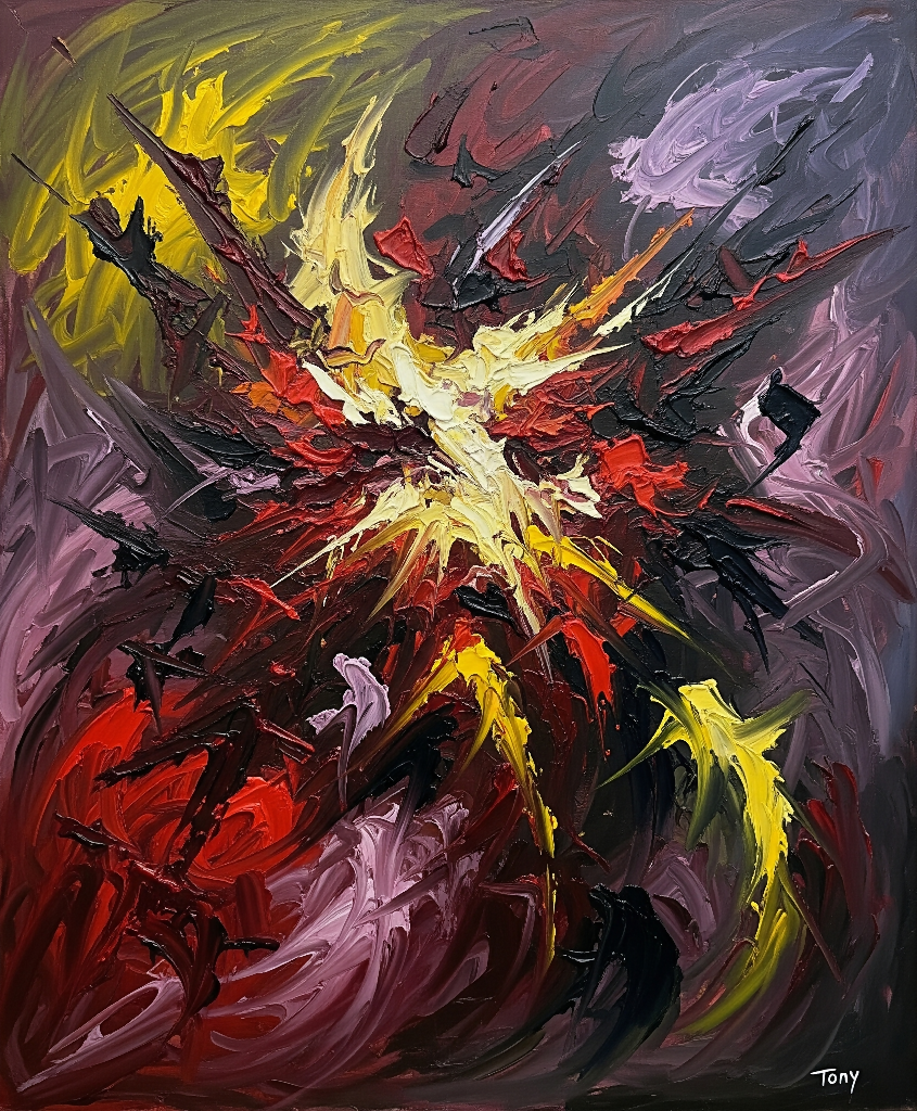 "Fear," is a striking example of modern expressionism. I had used a bold impasto technique, with thick, layered strokes of paint that create a chaotic, almost sculptural center. The colors—a mix of deep reds, dark purples, and stark blacks—are violently contrasted with an explosive burst of white and bright yellow, creating a sense of raw energy and conflict. The feeling it evokes is one of intense emotional turmoil, where a central point of panic radiates outwards, leaving behind a swirling vortex of darker emotions, generating Fear.