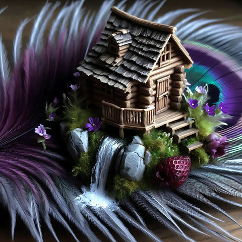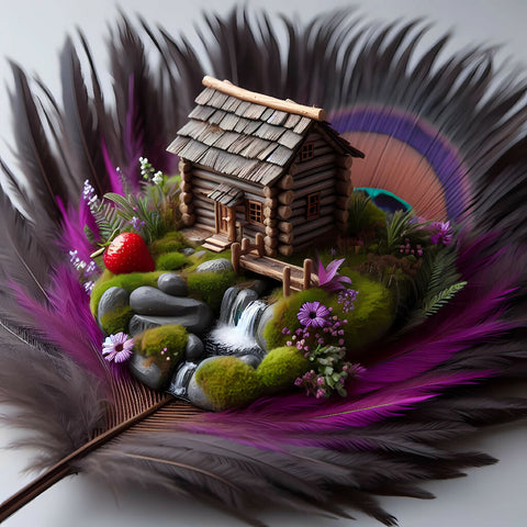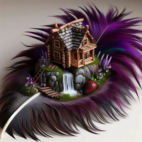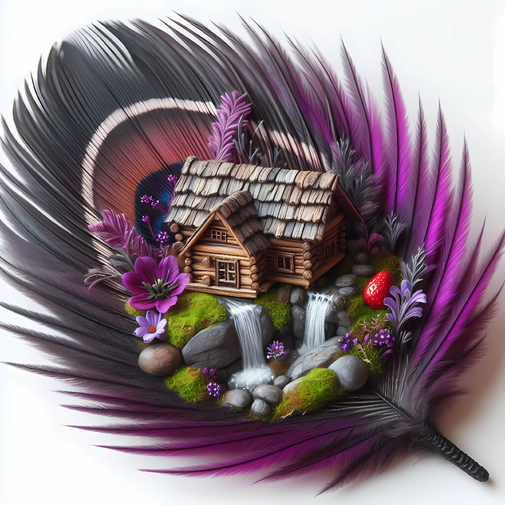 A miniature, whimsical log cabin nestled within a detailed, vibrant feather.  The cabin, constructed of light brown and gray logs, sits atop a bed of moss, with a small waterfall cascading down a rocky incline.  Purple flowers and blossoms are strategically placed around the cabin and throughout the feather, creating a lush, floral environment.  A single, bright red strawberry is positioned near the waterfall. The feather is a mix of deep purple, dark gray, and black hues, showing intricate feather details.  The lighting emphasizes the cabin, illuminating the interior with a warm glow.  The overall style is artistic and detailed, with a surreal feel, reminiscent of miniature landscape art. The feather takes up most of the frame, with the cabin and its surrounding elements in the center-midsection.  The cabin faces the viewer, and the waterfall flows horizontally across the frame.  The perspective is slightly angled downwards towards the cabin's features. The colors are rich and vibrant, with the purples and greens creating a harmonious blend. The atmosphere is peaceful and enchanting, evocative of a magical fairy tale.