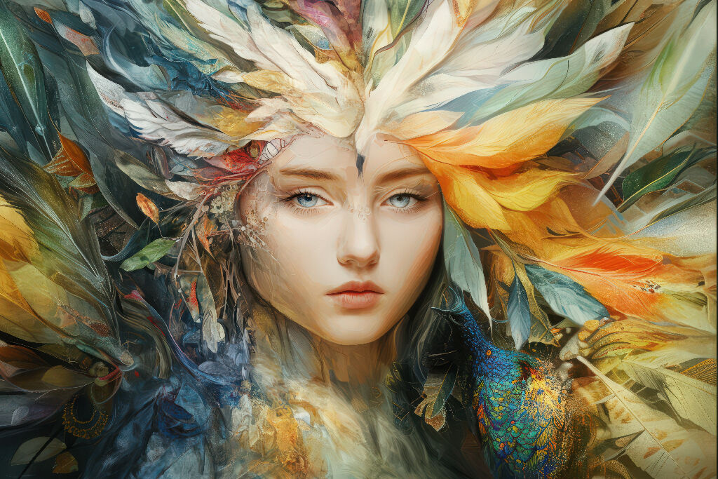 A breathtaking surreal portrait of a divine muse enveloped in an explosion of feathers, blending peacock blue, sunlit gold, and nature’s calmest greens. This artwork merges ethereal beauty with dreamlike composition, symbolizing harmony between humanity and the wild. A collector’s gem for fantasy and surreal art lovers.