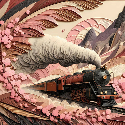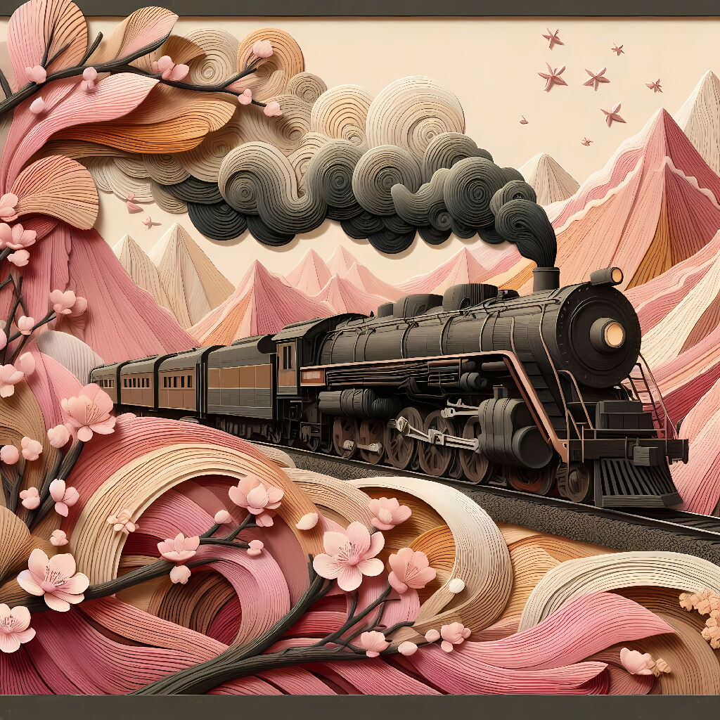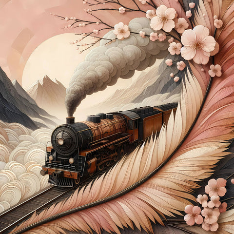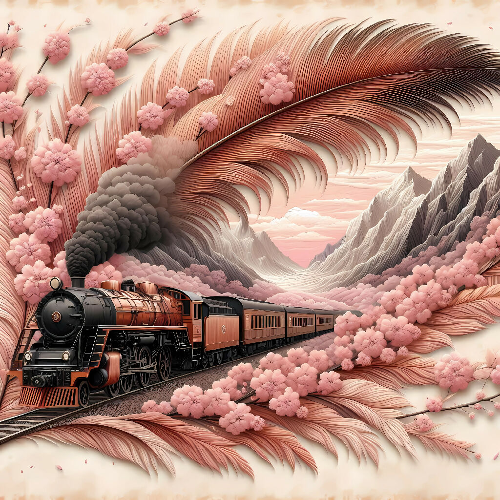 A stylized, multi-layered artwork depicts a train moving through a landscape of cherry blossoms and mountains.  A large, textured feather, in shades of pink, peach, and beige, forms the backdrop and frame. The train, a dark-brown and rust-colored steam locomotive, is in the foreground and center, moving from left to right. The train's details are meticulously rendered, with smoke billowing behind it.  Pink cherry blossoms and branches are intricately arranged, filling the space around and behind the train. The landscape behind the train includes soft, textured mountains, rendered in muted purples, grays, and light pinks.  A stylized building, resembling a traditional Asian-style tower, is visible in the upper right, with teal-green details.  The image employs a combination of techniques to create a sense of depth and texture. The composition is balanced with a focus on the train, situated on a trail, which extends through the scene.  Soft, diffused lighting bathes the entire scene in a calm, ethereal atmosphere.  The style is reminiscent of a mixed-media piece, employing elements of illustration and sculpted relief, combined with watercolor effects.  The overall feeling is romantic, and whimsical.