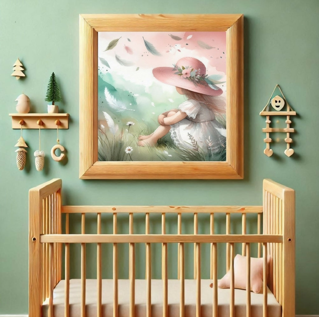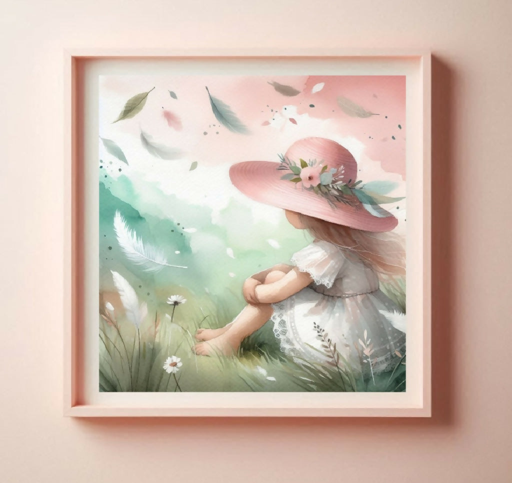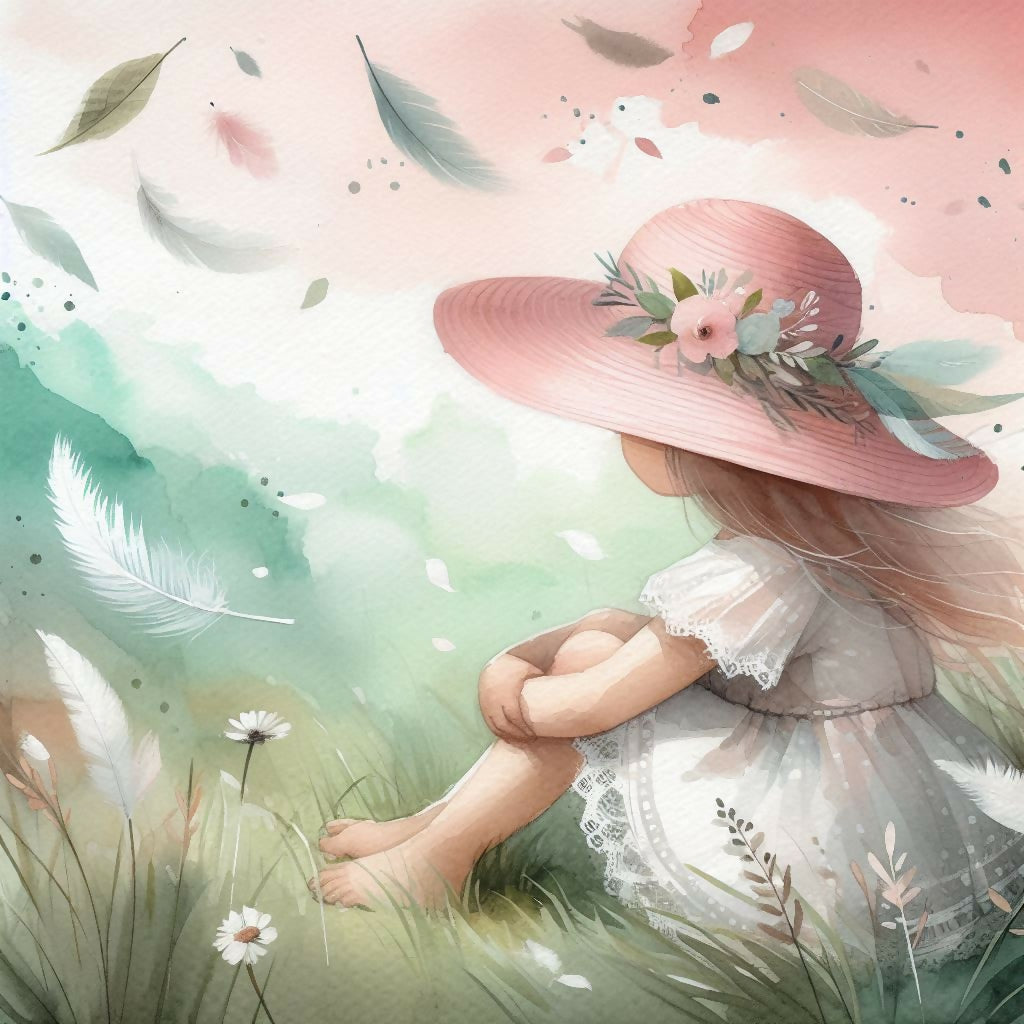 Auarellgemälde eines Mädchens, das von Federn im Wind umgeben ist.