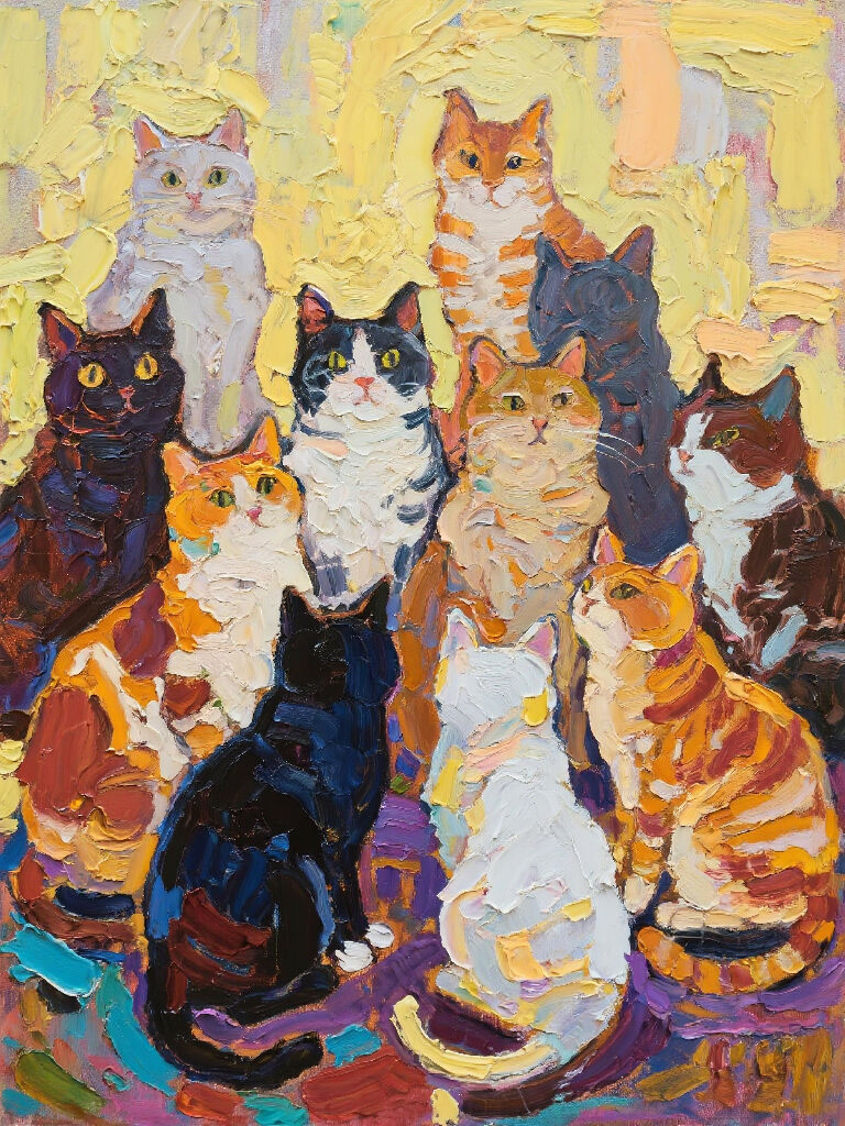 This warm, painterly piece captures a heartwarming gathering of feline friends, each uniquely styled yet harmoniously composed. Bathed in golden hues and thick impressionist brushstrokes, this AI-generated oil painting evokes the cozy bond of a close-knit cat clan.