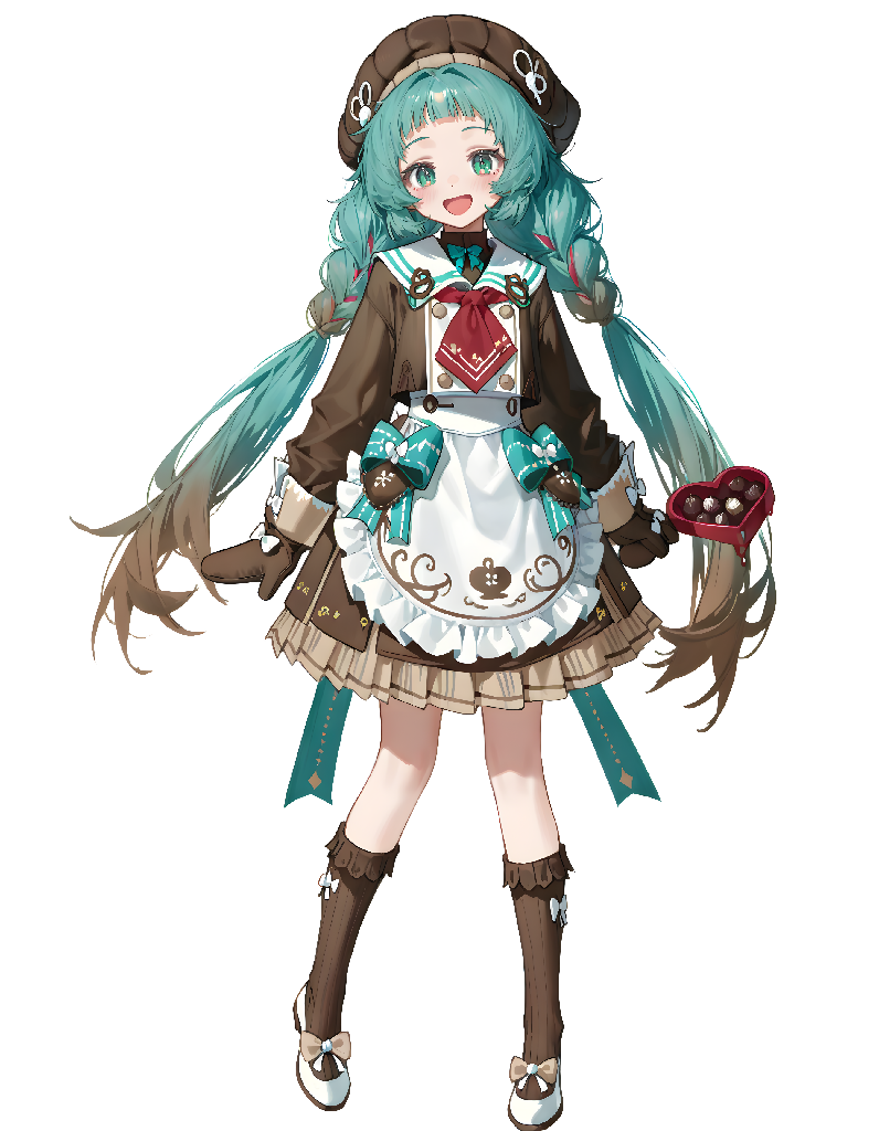 This character is inspired by bakeries and mint chocolate—a cheerful and skilled dessert maker, perfect as either a pastry apprentice or a cafe waitress.