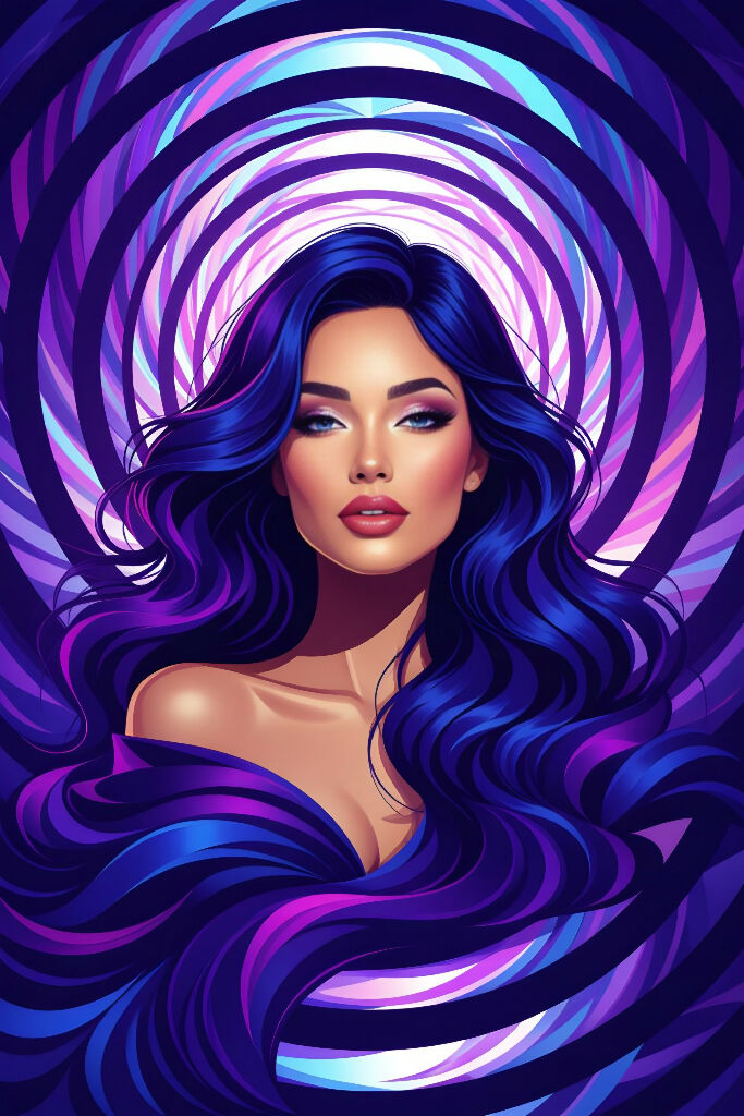 An abstract portrait of a woman showcases vibrant flowing hair in shades of blue and pink, set against a dynamic backgrou circular patterns. The artwork employs digital illustration techniques, blending colors and shapes to evoke a sense of move energy.
