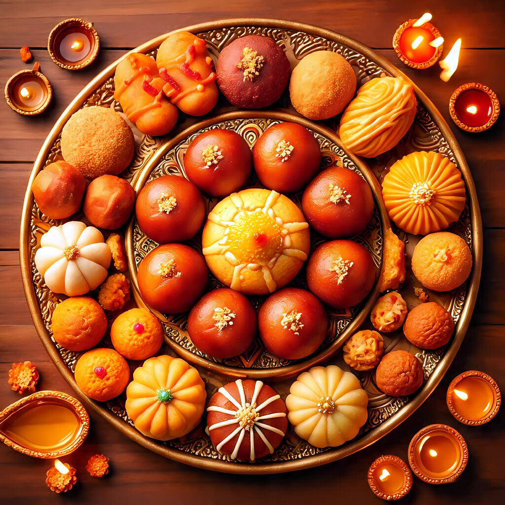 Celebrate the warmth and richness of Indian tradition with Festival Glow Sweet Harmony Still Life, a visually opulent AI-generated artwork that captures the essence of Diwali. A golden tray brimming with laddus, modaks, pedas, and silver-leafed confections sits at the heart of this composition, encircled by glowing diyas that cast a festive aura. This piece tells the story of a timeless ritual—families gathering around sweets and light, sharing joy and blessings. The intricate arrangement and warm tones evoke nostalgia, reverence, and celebration, making it a perfect addition to any cultural or festive art collection.