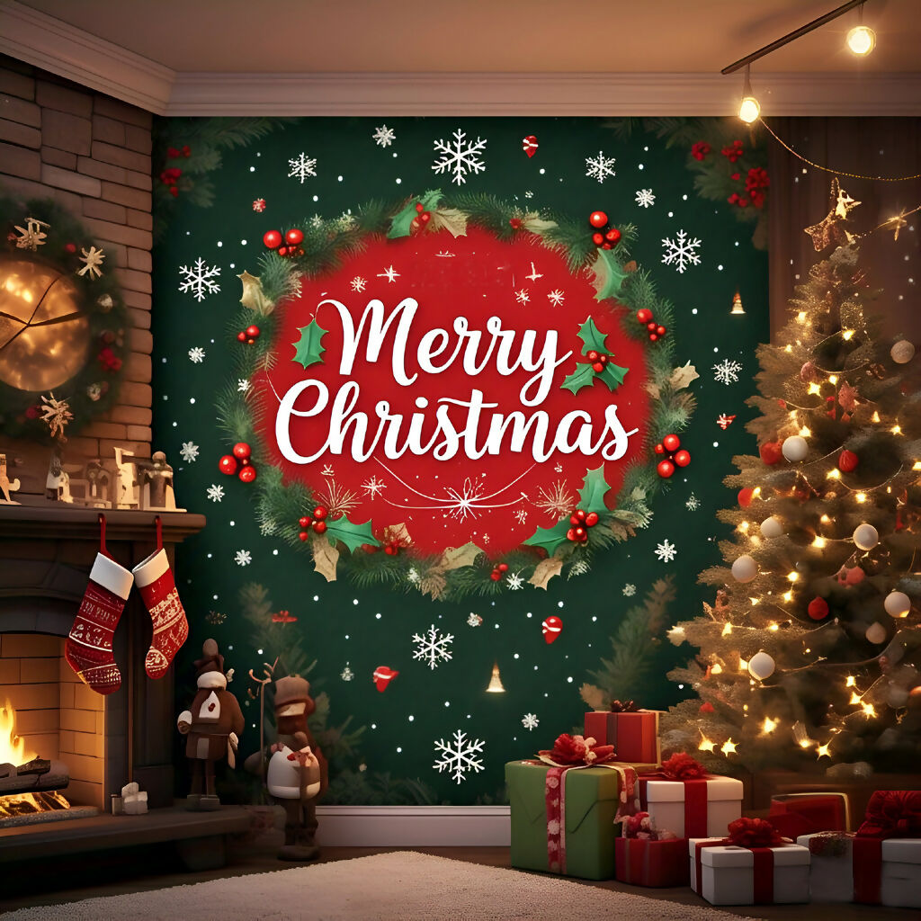 Celebrate the warmth of the holiday season with Festive Hearth & Holly, a richly detailed AI-generated still life artwork that captures the magic of Christmas in a cozy living room setting. The centerpiece is a bold “Merry Christmas” wall design framed by a wreath of holly, berries, and snowflakes, set against a deep green backdrop with golden tree icons and snowflake accents.