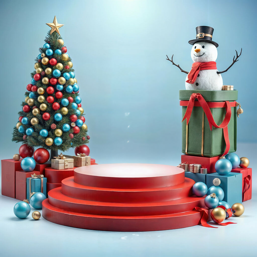 A vibrant 3D rendering captures the spirit of Christmas with a festive scene. A perfectly decorated Christmas tree adorned with red, blue, and gold ornaments stands tall beside a multi-tiered red podium. On the other side, a cheerful snowman peeks out from a giant green gift box topped with a bright red bow. Scattered around the base are wrapped presents and colorful baubles, completing the joyful holiday atmosphere.