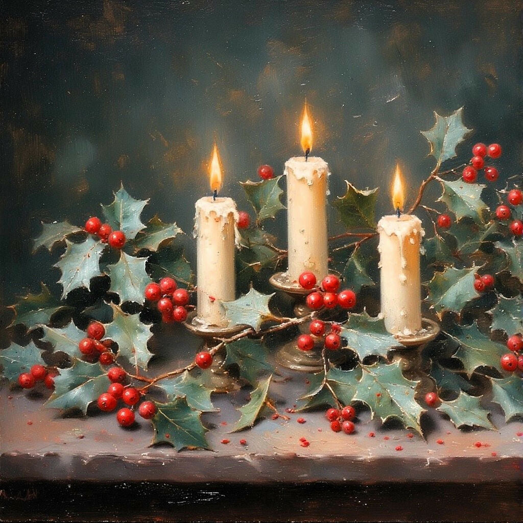 This Ai image is a painting featuring three lit candles, each casting a warm, soft glow. They are surrounded by a lush arrangement of green holly leaves with their characteristic spiky edges, and vibrant red berries.