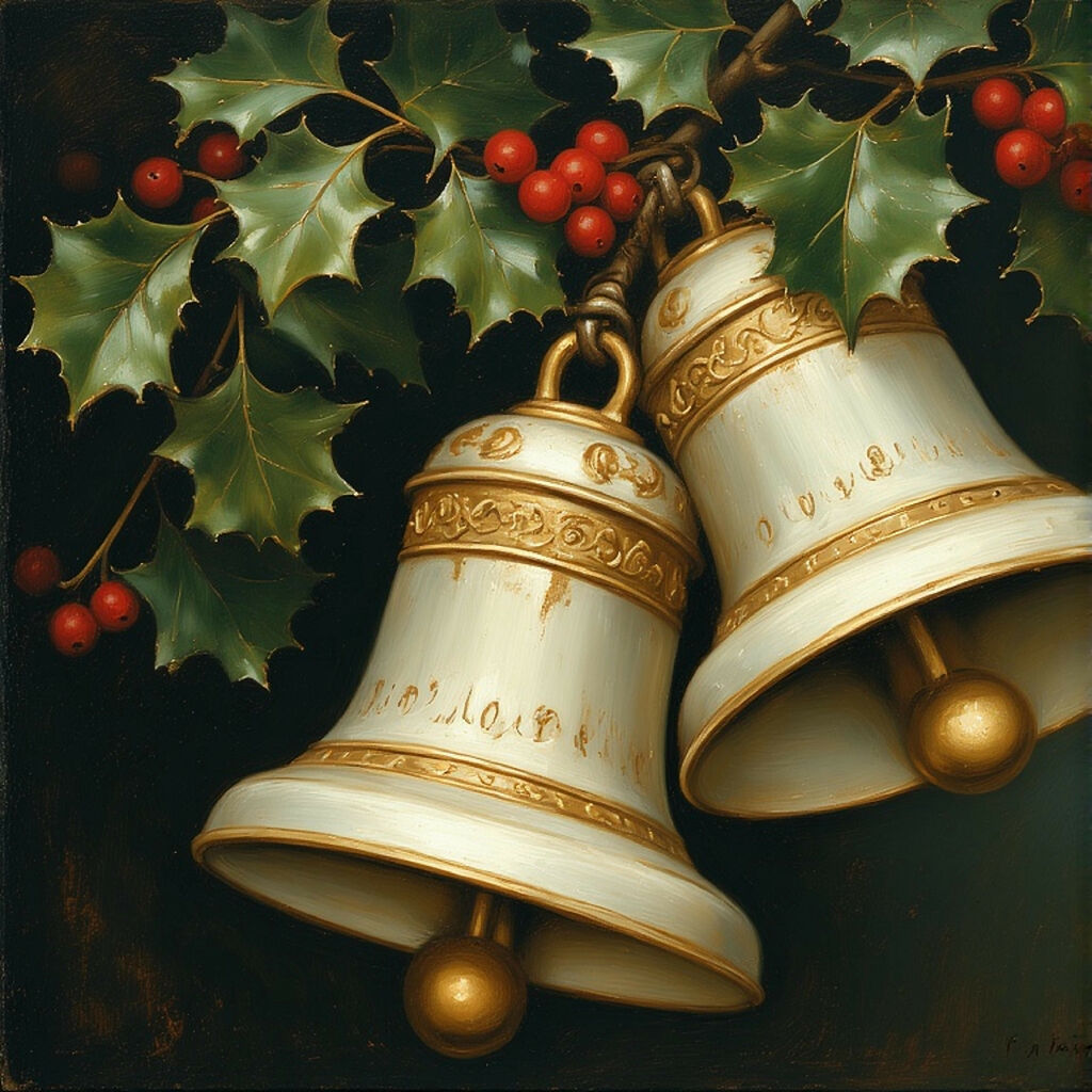 This Ai image captures two ornate, cream-colored bells with intricate gold detailing, suspended from vibrant green holly branches adorned with bright red berries.
