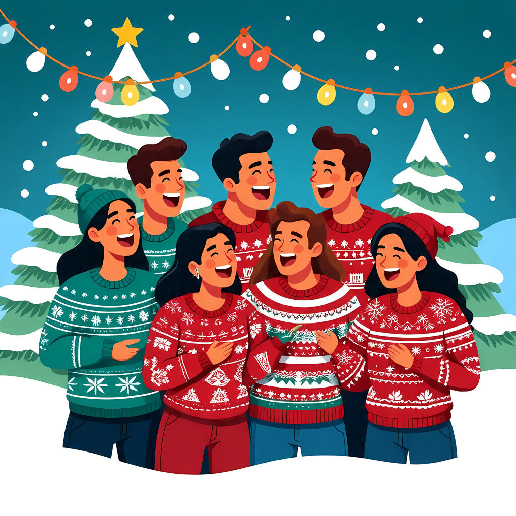 This enchanting artwork captures the warmth of togetherness in a snowy wonderland. Seven joyful figures, dressed in vibrant holiday sweaters, gather beneath twinkling string lights and snow-covered evergreens. A star-topped tree glows in the background, symbolizing hope and unity. The falling snow adds a magical touch, evoking the timeless spirit of celebration. This piece tells the story of friendship, laughter, and shared traditions—reminding us that the true beauty of winter lies in the bonds we cherish.