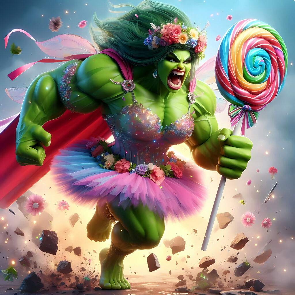 A dazzling fusion of brute strength and delicate beauty, this AI-generated artwork captures a green-skinned powerhouse charging forward in a glittering ballerina dress. Her floral crown and swirling lollipop contrast wildly with her muscular form and explosive energy. Inspired by the idea that femininity and ferocity can coexist, this piece reimagines the superhero archetype through a playful, pop-art lens. The flying petals and shattered ground symbolize the clash of softness and strength—making this a visual anthem of empowerment and eccentricity.