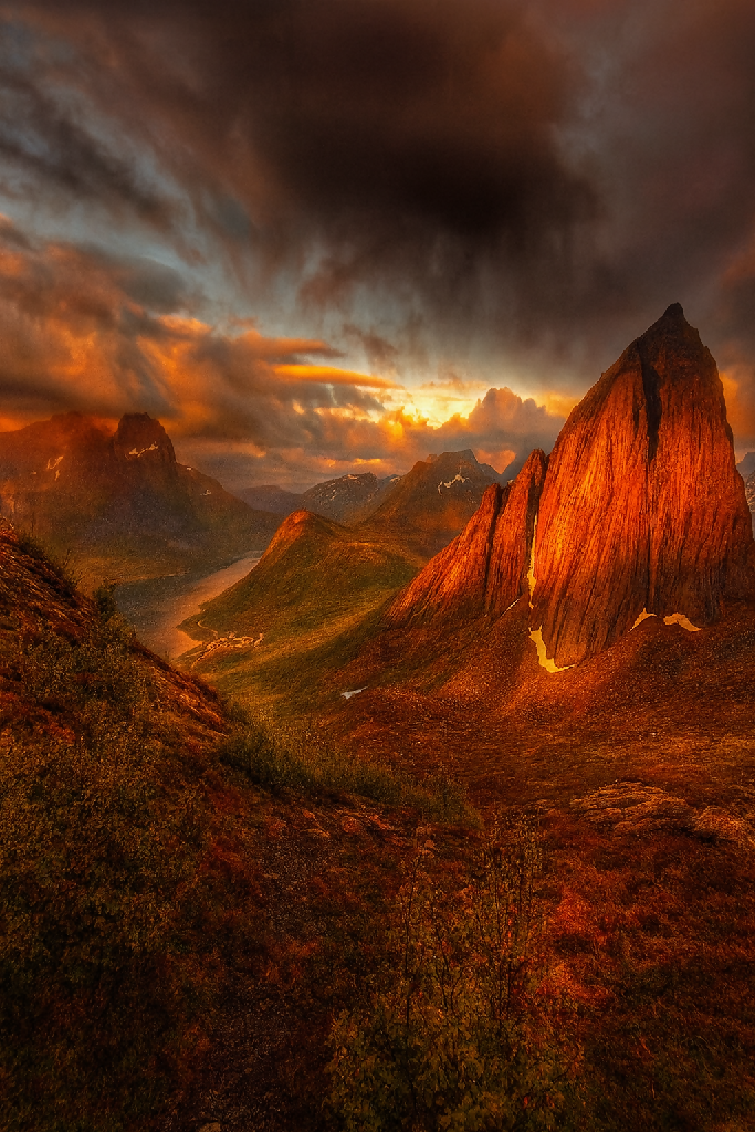 Bathed in the blazing light of a dramatic sunset, jagged mountains rise from the untouched Arctic wilderness. The warm orange glow ignites the rugged cliffs while deep shadows carve their shapes against a stormy sky, capturing the raw power and beauty of Norway’s northern landscapes.