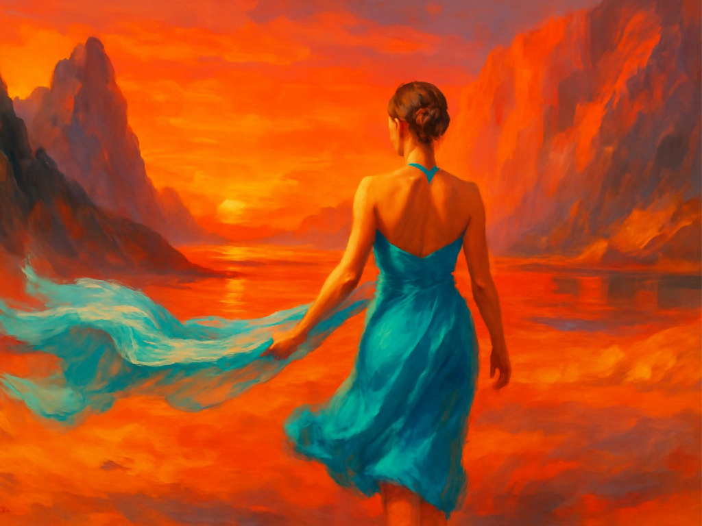 Immerse yourself in the vibrant energy of a desert sunset with this captivating figurative sunset seascape painting digital art. This stunning artwork features a woman in a flowing dress facing a dramatic landscape of mountains and water, bathed in striking orange and blue hues. Perfect for modern wall decor, vibrant home art, or a unique printable gift, this high-quality instant download wall art brings a sense of awe and wonder to any space.