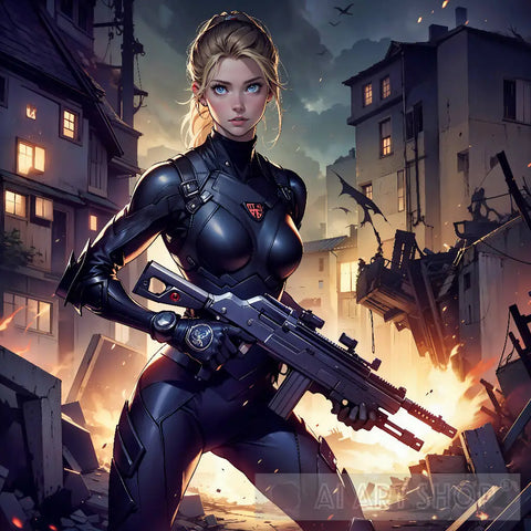 She knew they were coming. She could feel their presence in the air, like a cold breath on her neck. She checked her rifle, making sure it was fully loaded and ready to fire. She wore a suit of tech armor, sleek and shiny, that enhanced her strength and speed. She was the last one left, the final girl, and she was not going down without a fight.