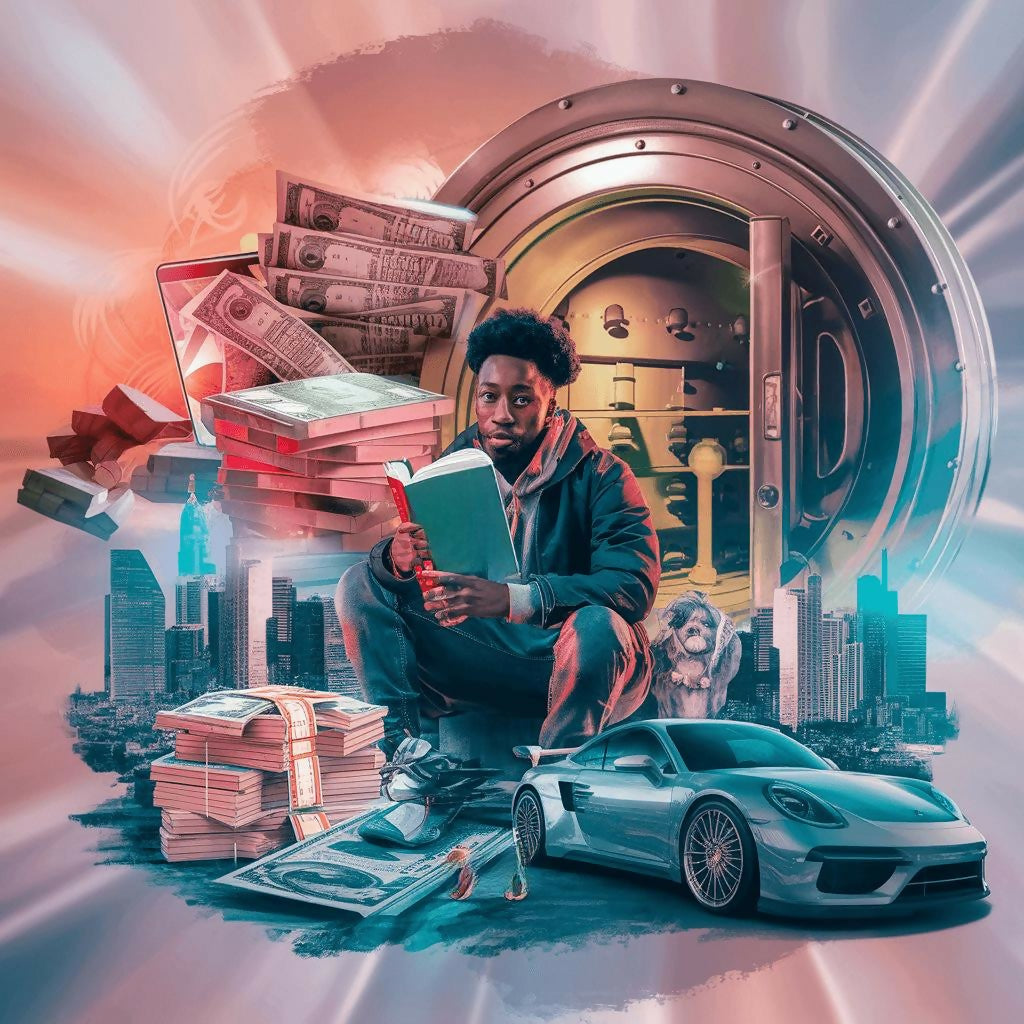 This vibrant digital artwork depicts a young man's financial aspirations through a surreal, dream-like composition. The central figure sits reading a book titled "MORE MONEY NOW" amidst symbols of wealth and success. Behind him, an open bank vault radiates light, while stacks of money, a luxury sports car, and a cityscape fill the scene. The image blends realism with fantastical elements, using a colorful palette to create an energetic, aspirational atmosphere.