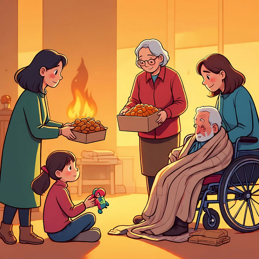 This warm and heartfelt artwork portrays a family gathered near a glowing fireplace, embodying love, care, and intergenerational bonding. A young girl plays with her toy on the floor, while a woman in a green dress offers a box of oranges to an elderly woman in a red sweater. Nearby, another woman stands gently behind an elderly man in a wheelchair, wrapped in a blanket for comfort. The oranges symbolize health and festive generosity, while the cozy fire represents warmth and protection. This piece tells a timeless story of compassion, family unity, and the beauty of caring for loved ones across generations.