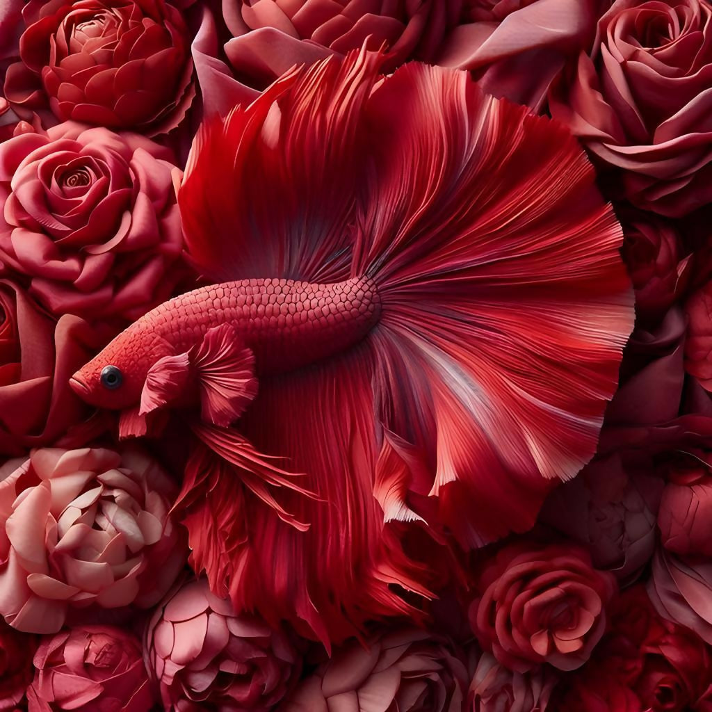 Dive into a surreal dreamscape where a graceful fish swims through a sea of blooming roses. This captivating artwork blends the elegance of marine life with the delicate beauty of flowers, evoking a sense of peace, fantasy, and poetic wonder.