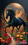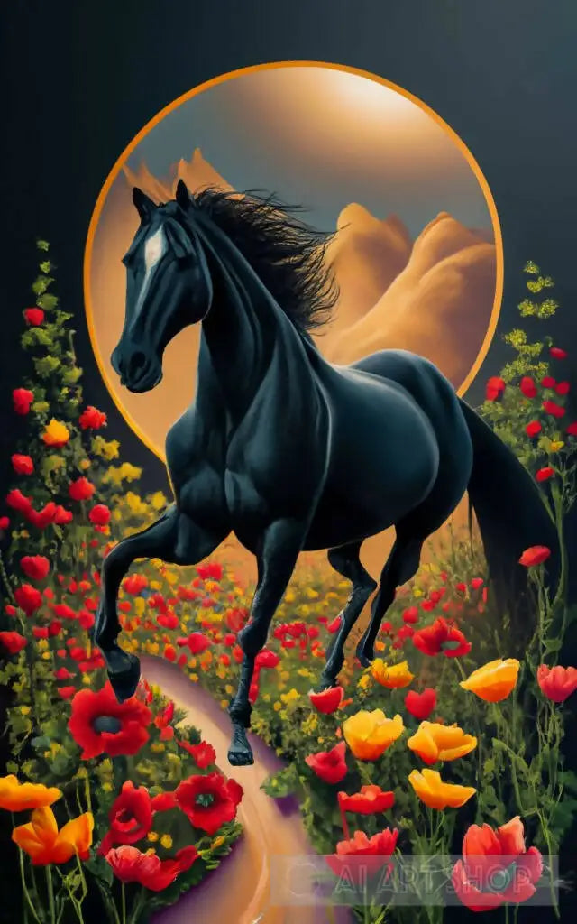 On a black canvas,  a flawless horse silhouette is crafted by dark poppies along a golden path, creating an illustrative piece that embodies conceptual art.