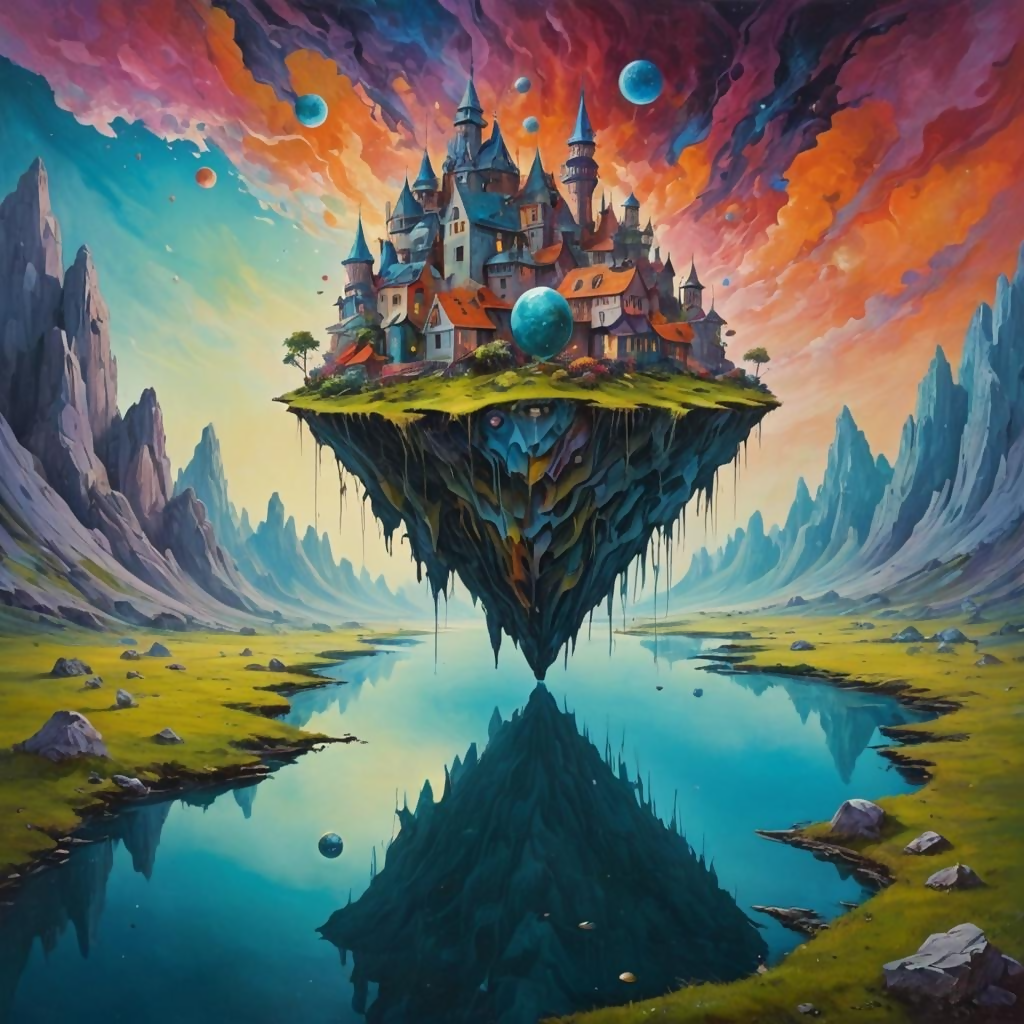 A fantastical landscape where a majestic citadel, perched atop a floating landmass, dominates the sky. The citadel reflects perfectly in the lake below. An otherworldly sky full of colorful clouds enhances the whimsical and dreamlike quality of the artwork.