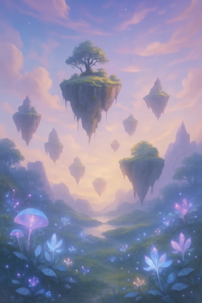 "Floating Island Serenity" invites you to explore a captivating vista of floating landmasses, each adorned with lush greenery and solitary trees reaching towards a gentle, cloud-strewn sky. The foreground reveals a mystical landscape with glowing flora, hinting at a hidden world below. The soft, ethereal color palette and delicate lighting create a sense of peace and otherworldly beauty, making this a truly captivating piece of digital art.