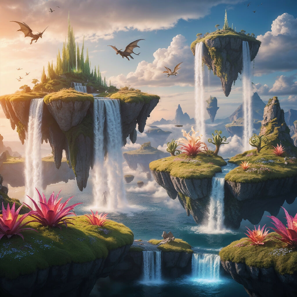 floating islands, fantasy landscape, dragons, magical world, mythical realm, AI art, dreamscape, waterfalls, surreal, cloud kingdom