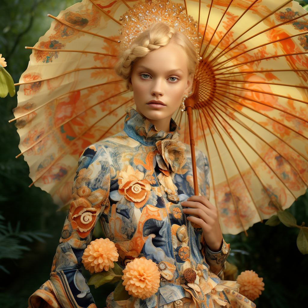 Tags: baroque elegance, floral portrait, feminine aesthetic, ornamental fashion, botanical opulence, parasol art, theatrical style, nature-inspired design
