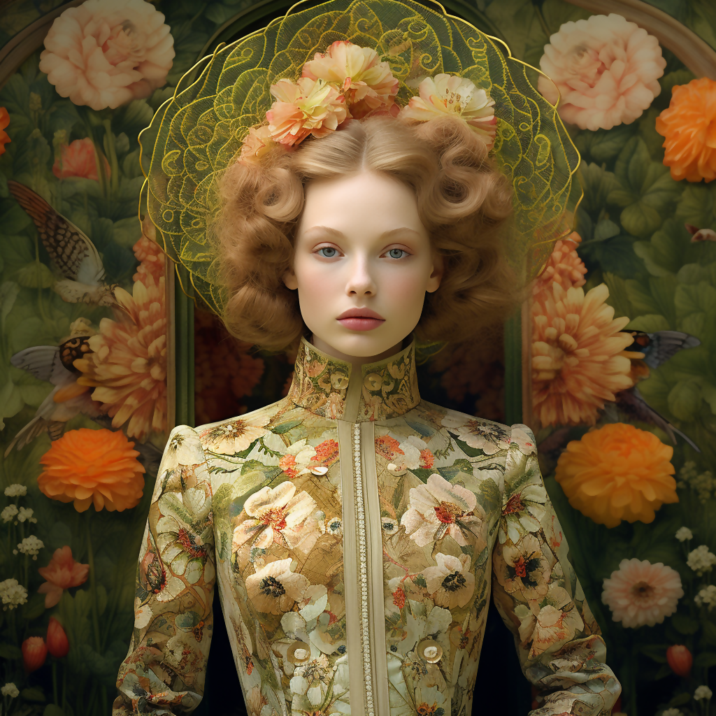 A woman stands at the heart of a blooming sanctuary, her presence both serene and surreal. Framed by a golden halo and embroidered in flora, she becomes part of the garden itself—an emblem of quiet elegance and natural wonder. “Floral Sanctuary” invites the viewer into a world where beauty blossoms without boundaries.