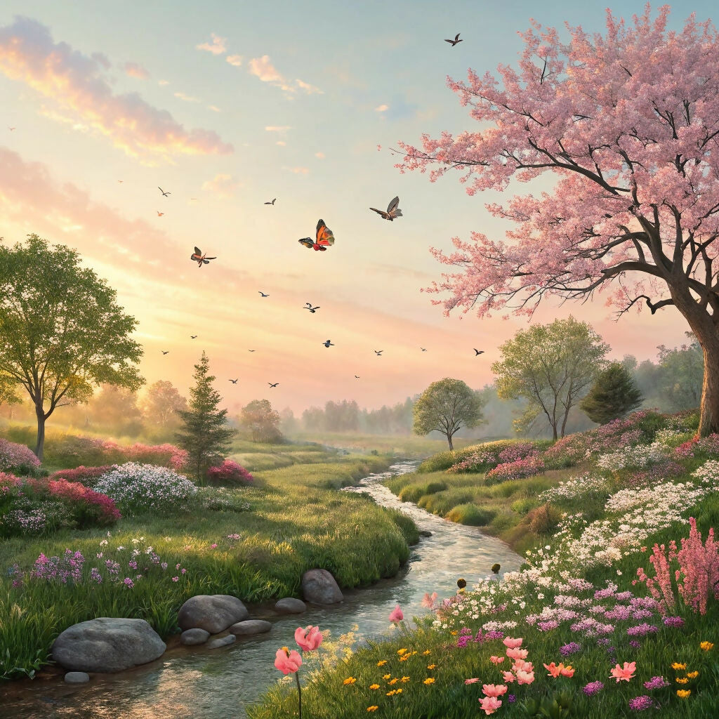 A gentle stream winds through a meadow filled with a vibrant array of flowers in various shades of pink, purple, white, and yellow. Lush green grass and foliage surround the stream, and small, scattered rocks are visible along the water's edge.