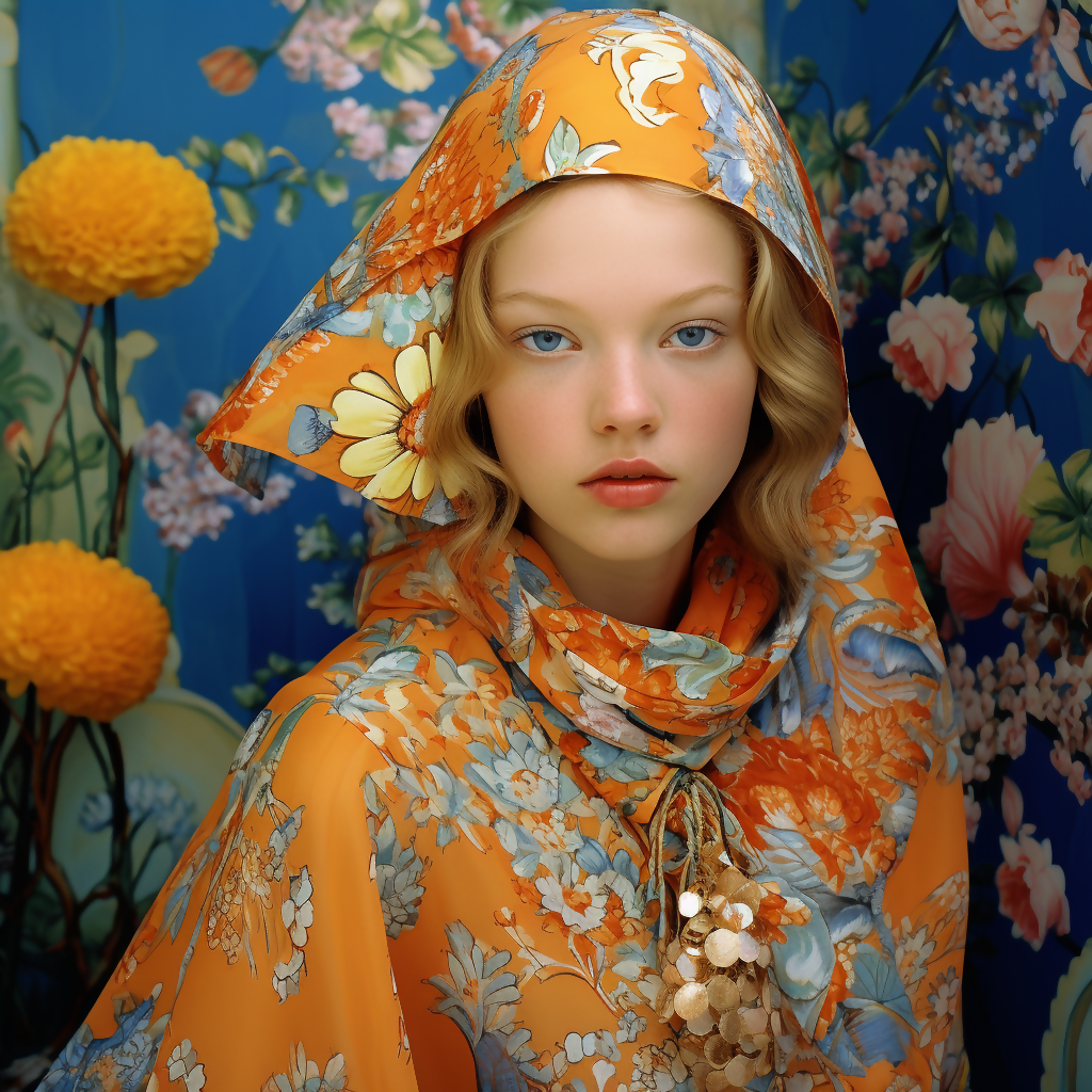 Tags: Floral, Botanical, Fantasy, Guardian, Nature, Costume, Embroidery, Ornate, Surreal, Orange, Blue, Yellow, Headscarf, Spirit, Summer, Fashion Art