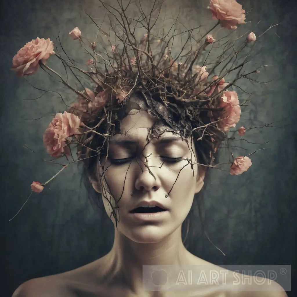 is an artistic representation showing a person with an intricate crown made of branches and pink flowers, possibly roses, sprouting around the head.