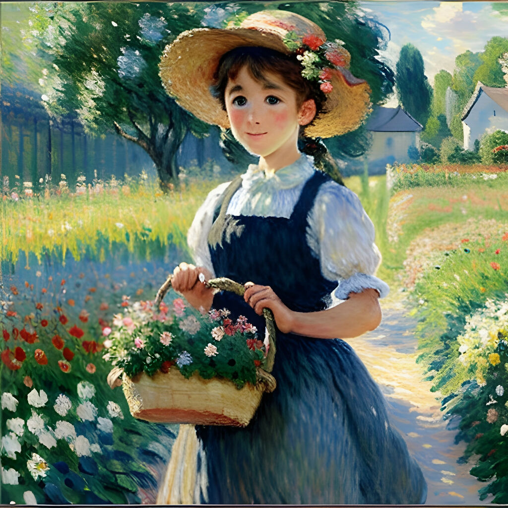 There is  beautiful girl with a basket walking on a grass path in a dimly lit forest、She wears a straw hat and uses it as a floral hair ornament、At the exit of the forest where she is walking, you can see a paradise of flowers spreading out in the dazzling light.、